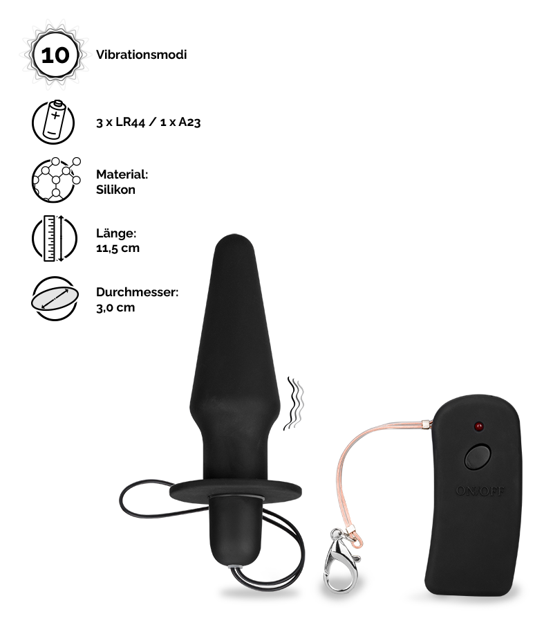 Dieses Sextoy ist sowohl für Anfänger als auch für erfahrene Nutzer von Anal-Toys geeignet, da es einen mittleren Durchmesser hat und der Schaft nach oben spitz zuläuft. Dadurch lässt sich der Plug sehr gut einführen. Damit trotzdem eine intensive Stimulation möglich ist, bietet dieser Plug 10 unterschiedliche Vibrationsstufen. Mit der kabellosen Fernbedienung haben Sie die Möglichkeit, den Analvibrator selber bequem aus der Ferne zu steuern oder das Kommando über Ihre anale Lust an Ihren Partner oder Ihre Partnerin abzugeben.