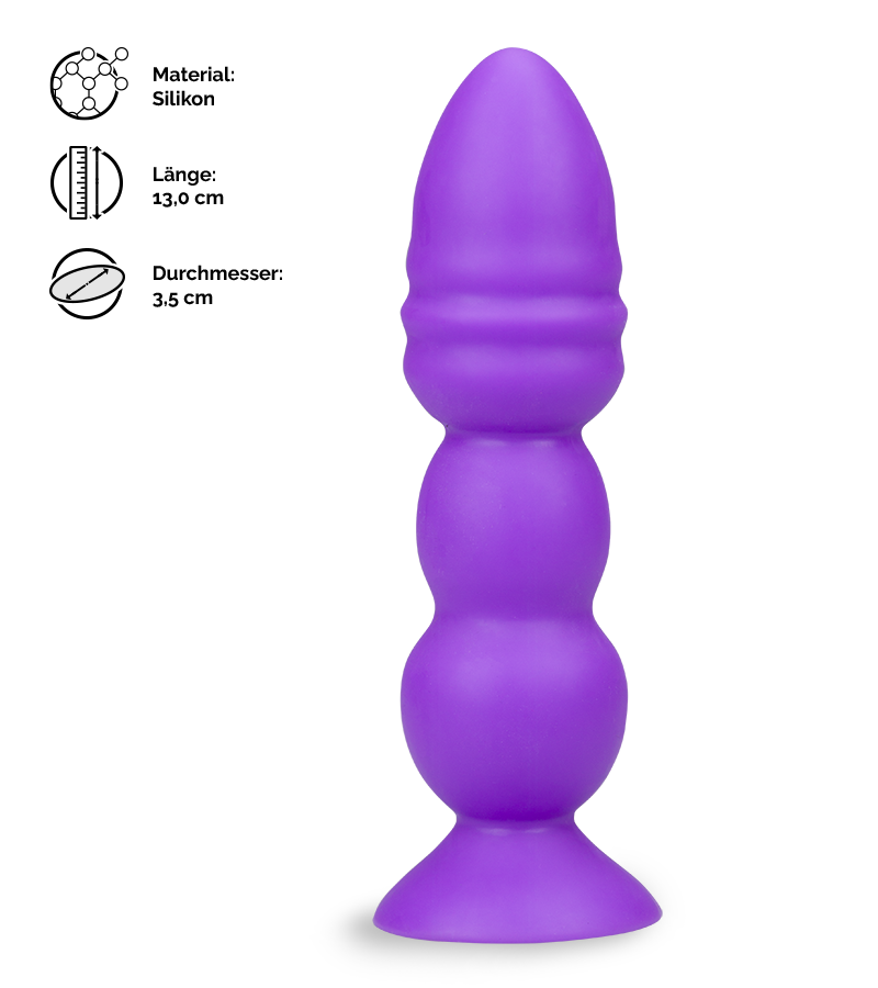 Der Kugelplug mit Saugfuß Hype ist 13 cm lang und 3,5 cm breit. An der dicksten Stelle hat der Plug einen Durchmesser von 3,5 cm.