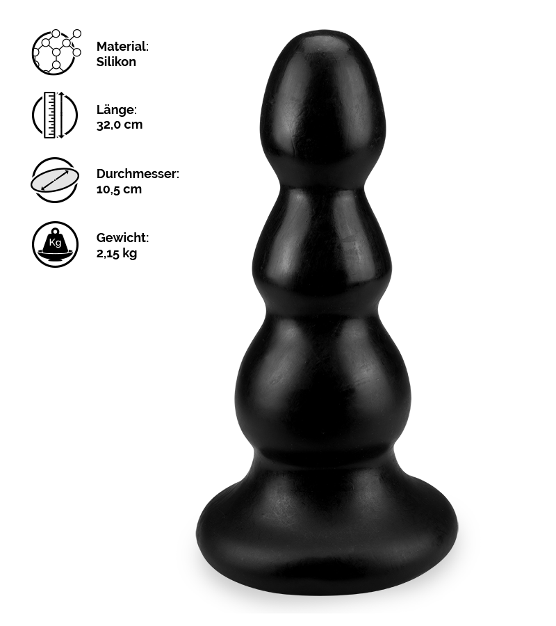 Mit seiner beeindruckenden Größe ist dieser Analplug eine lustvolle Herausforderung für Ihr Hintertürchen. Der Schaft des XL-Plugs besteht aus 3 Kugeln, deren Durchmesser nach und nach ansteigt. Die kleinste Kugel an der Spitze hat einen Durchmesser von 7 cm. Es folgt eine Kugel mit einem Durchmesser von 8 cm und die größte Kugel hat einen Durchmesser von 10,5 cm. Der Plug ist ideal für anspruchsvolle Fans von Analdehnung.