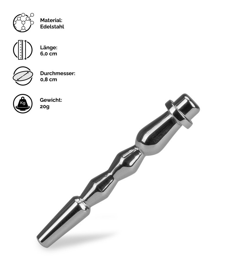 Die kurze Harnröhrensonde Trinket hat eine Gesamtlänge von 6 cm und einen Durchmesser von 0,8 cm an der breitesten Stelle.