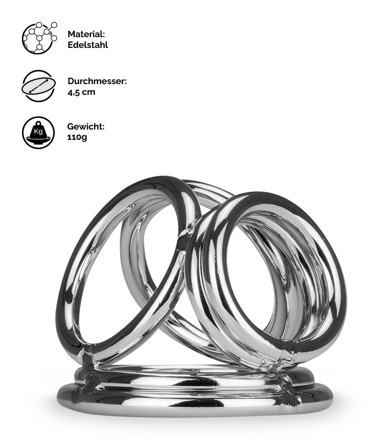 Der vierfache Penis- und Hodenring aus glänzendem Edelstahl übt sanften Druck auf Penis und Hoden aus. Durch den dabei erzeugten Blutstaueffekt erhalten Sie besonders kräftige Erektionen. Gleichzeitig halten Sie länger durch und kommen später, sodass besonders Ihr Partner oder Ihre Partnerin von Ihrer neuen Ausdauer profitieren kann.
