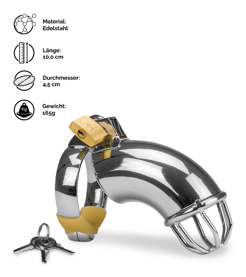 Der Keuschheitsgürtel für Männer Turtleneck ist aus Edelstahl gefertigt und wird mit einem Vorhängeschloss und drei Schlüsseln geliefert. Er hat eine Gesamtlänge von 10 cm und der Haltering, der hinter den Hoden sitzt, hat einen Durchmesser von 4,5 cm.