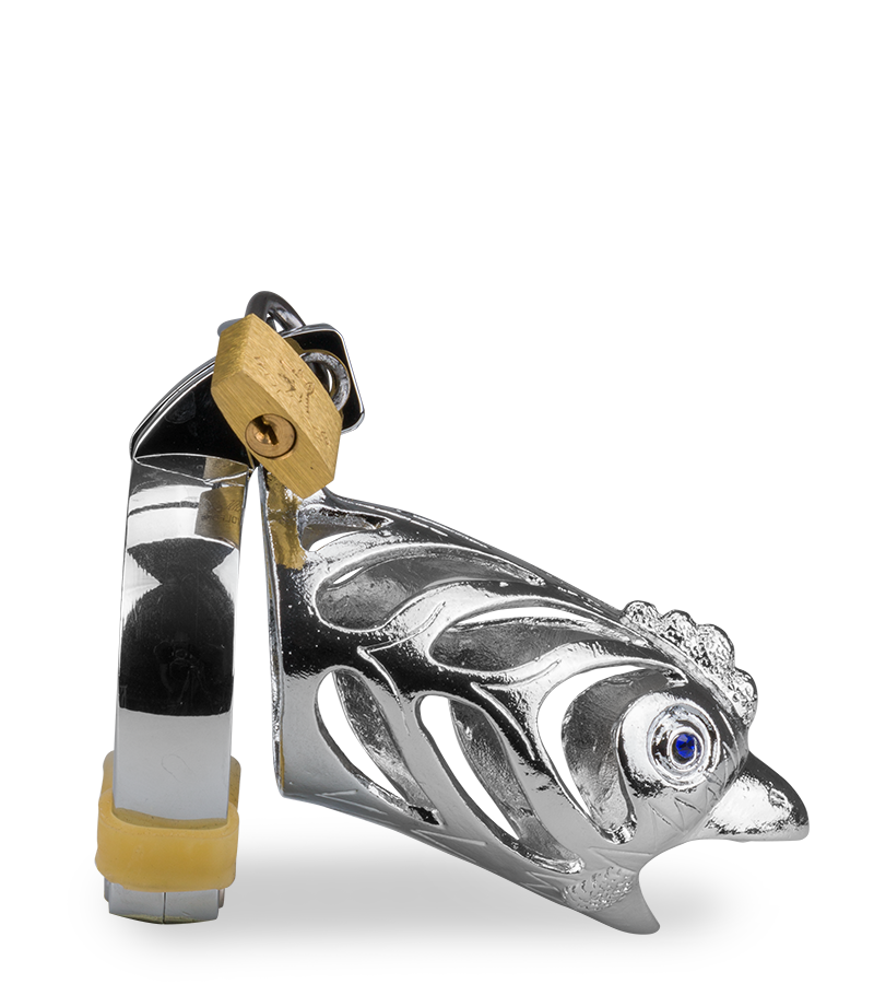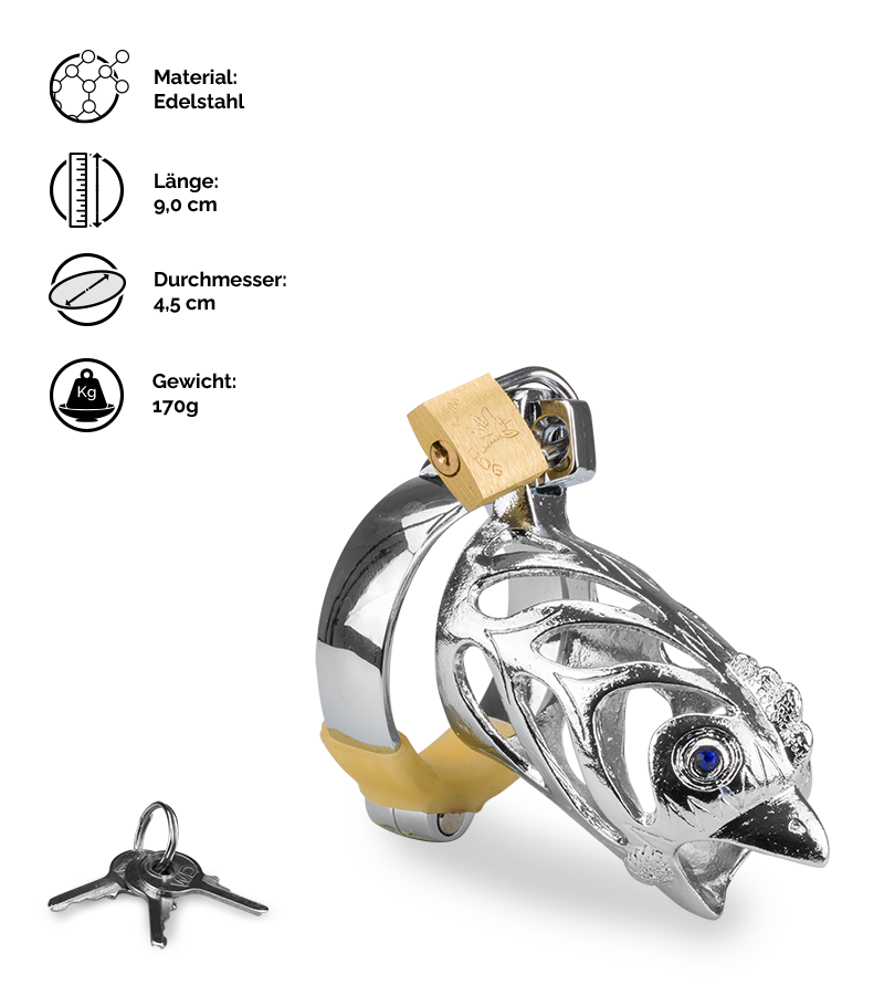 Der Peniskäfig aus robustem Edelstahl macht eine Erektion unmöglich. Durch die kleinen Öffnungen an der Seite und vorne kann der Penis aber dennoch sanft stimuliert werden. Auch Urinieren ist möglich. Somit kann der Keuschheitsgürtel auch über einen längeren Zeitraum getragen werden. So lange, bis das kleine Schloss wieder aufgeschlossen und Ihr Penis aus seinem Gefängnis befreit wird. Der Peniskäfig hat ein originelles Design im Stil des chinesischen Tierkreiszeichens Hahn.