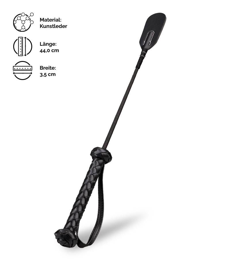 Die Gerte bietet Ihnen zahlreiche Einsatzmöglichkeiten. Züchtigen Sie Ihren Lustsklaven mit etwas Spanking oder geben Sie ihm sanfte Schläge, um ihn auf die richtige Bahn zu lenken oder steigern Sie die Lust durch sanfte Streicheleinheiten mit der breiten Klatsche. Die BDSM-Gerte ist einfach das perfekte BDSM-Zubehör. Sie besteht aus einer breiteren Klatsche, einem Stab und einem praktischen Griff. Der Griff liegt gut in der Hand und ist mit einer Schlaufe versehen, die Sie über das Handgelenk ziehen können. Das verwendete Material Kunstleder verleiht der Gerte Langlebigkeit und eine tolle Optik.