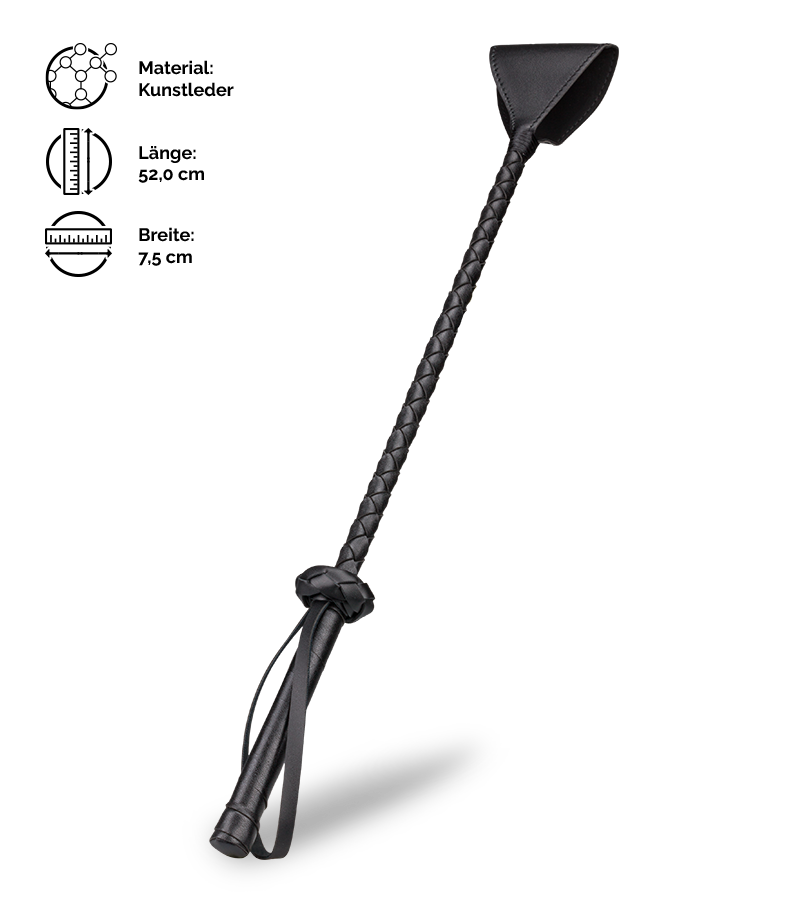 Die Gerte ist im BDSM eigentlich ein Instrument für die körperliche Züchtigung. Sie kann aber auch für ein sanftes Kitzeln oder Streicheln eingesetzt werden. Die breite, weiche Spitze kann sehr zart über empfindliche Körperstellen streichen oder mit Schwung und Kraft eingesetzt werden. Die Reitgerte ist komplett aus Kunstleder gefertigt und hat ein sehr elegantes Aussehen. Am Griff befindet sich eine praktische Schlaufe zum Befestigen und Aufhängen. So haben Sie die SM-Gerte immer griffbereit, wenn sich Besuch auf Ihrer SM-Spielwiese ankündigt.