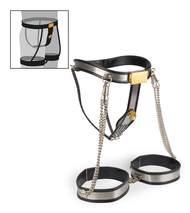 Dieses Sexspielzeug bietet Ihnen unterschiedliche Nutzungsmöglichkeiten. Wenn Sie den Keuschheitsgürtel anlegen, legt sich eine flache Metallplatte auf den Schritt. Schamlippen und Klitoris sind somit von außen nicht mehr zugänglich. Zusätzlich können Fesseln an die Oberschenkel angelegt werden, die verhindern, dass die Trägerin die Beine öffnen kann. Somit verfügt dieser Keuschheitsgürtel über eine doppelte Sicherung. Der Gürtel, die Fesseln und die Metallplatte sind verstellbar und können angepasst werden. Die Metallteile sind auf ihrer Innenseite für einen optimalen Tragekomfort mit einer Schicht aus Latex versehen. Auch die Ketten, die hinten verlaufen, sind mit einer Schicht Latex überzogen.