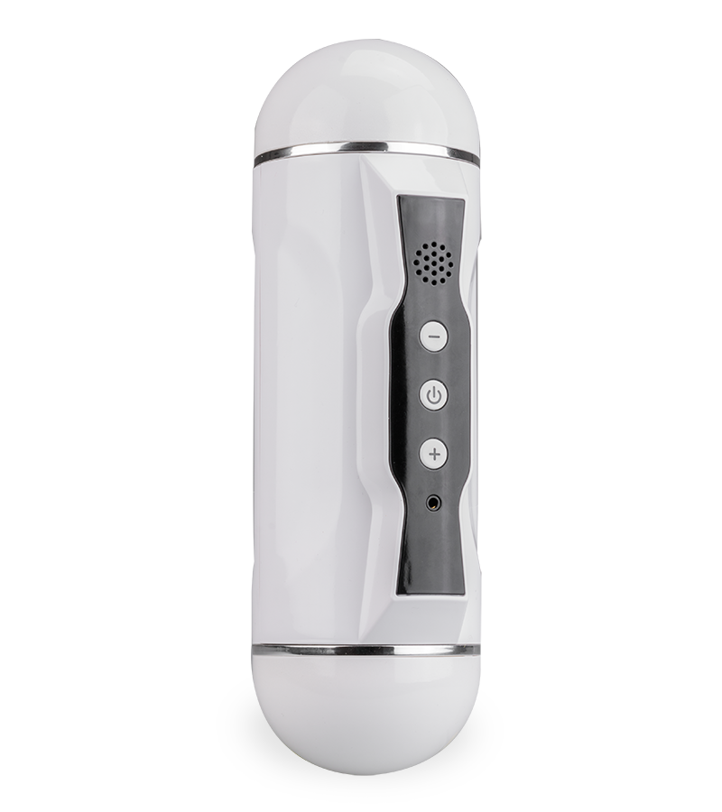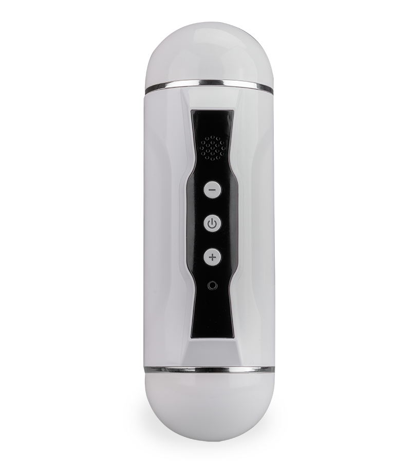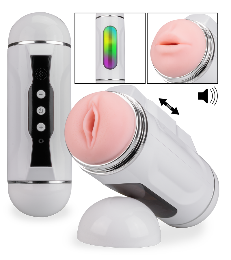 Der Masturbator aus ABS und TPE hat zwei unterschiedliche Öffnungen. Vagina- und Mund-Öffnung sind jeweils innen gerillt und genoppt. Den stimulierenden Massageeffekt der Oberflächenstruktur im Lustkanal lässt sich verstärken, wenn Sie die Stoßfunktion einschalten. Insgesamt stehen Ihnen 3 Modi zur Verfügung. Für den Extrakick lässt sich eine Audiofunktion mit weiblichen Stöhngeräuschen aktivieren. Farbige Leuchtakzente, die beim Einschalten aufleuchten, machen die Solosex-Party perfekt.