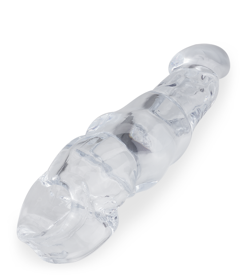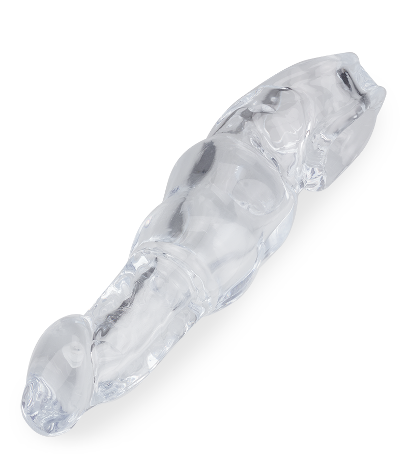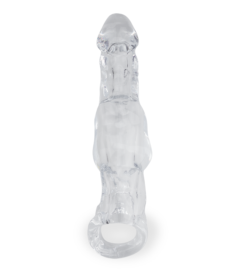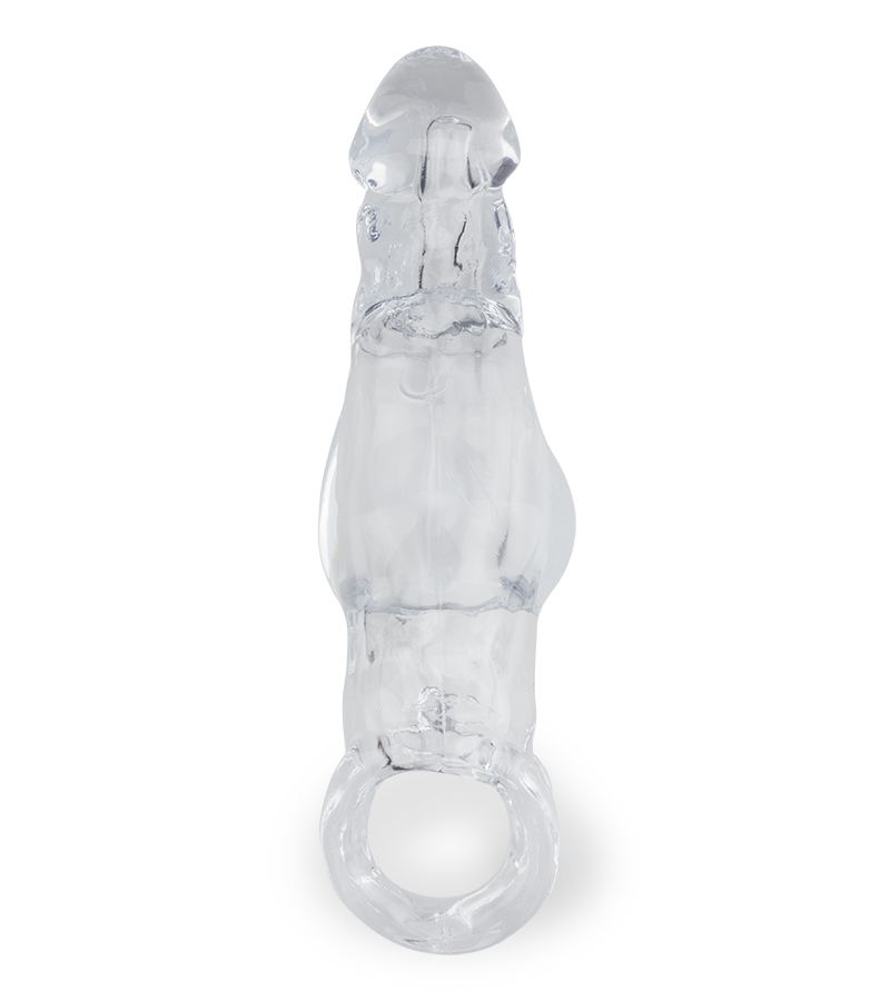 Gönnen Sie Partnerin oder Partner ein intensiveres Empfinden beim Sex mit der durchsichtigen Penishülle mit Hodenring Gordon!