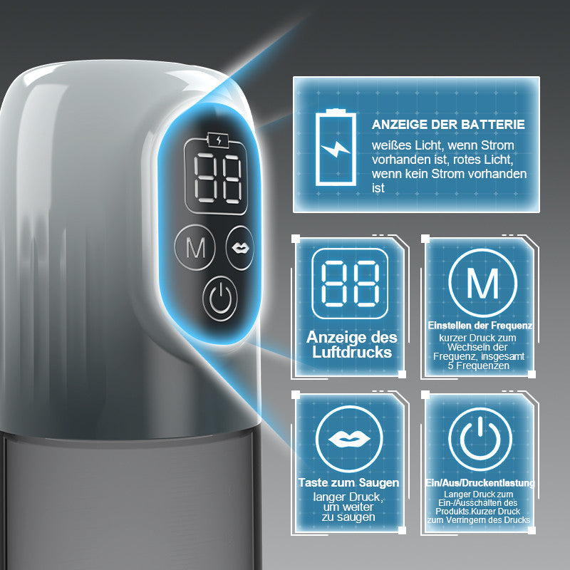 Beim Ausprobieren der 5 Saugmodi und 6 Trainingseinstellungen werden Sie die progressiven Änderungen der Druckstufen spüren, die speziell darauf ausgelegt sind, Ausdauer und Kraft aufzubauen. Bei jeder Sitzung verbessert der kontrollierte Vakuumdruck die Durchblutung, was allmählich zu stärkeren Erektionen und mit der Zeit zu mehr Ausdauer führt. Die klare LED-Anzeige informiert Sie über den aktuellen Druck und wenn Sie die Messungen des Zylinders beobachten, werden Sie von den visuellen Ergebnissen begeistert sein. Diese Kombination aus wasserbasierter Stimulation und Drucktraining hilft nicht nur bei der Entspannung, sondern auch beim Aufbau von Selbstvertrauen für zukünftige intime Begegnungen.