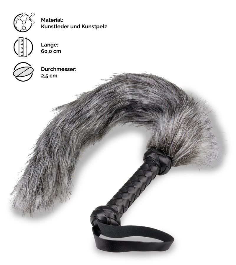 Die Fuchsschwanz-Peitsche ist 60 cm lang, Griff inklusive. Der Griff hat einen Durchmesser von 2,5 cm. Der Fuchsschwanz ist 45 cm lang.
