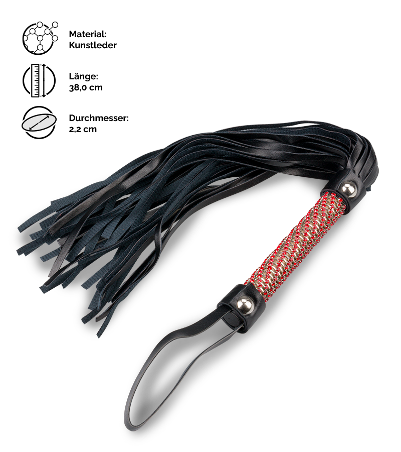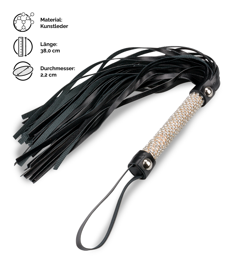 Die kleine Peitsche überzeugt mit dem strassbesetzten Griff und den weichen Riemen aus schwarzem Kunstleder. Mit der kompakten Größe und der tollen Kombination aus schlichtem Design und extravaganten Schmucksteinen ist diese Peitsche das perfekte Accessoire, um Ihren Partner oder Ihre Partnerin sanft zu kitzeln und zu streicheln oder zu bestrafen und auszupeitschen. Dank der mittellangen Riemen ist die kleine Peitsche sehr gut für BDSM-Anfänger geeignet. Die Trageschlaufe am Griff sorgt dafür, dass Ihnen die Peitsche nicht aus der Hand fällt. Außerdem können Sie sie an der praktischen Schlaufe an einem Haken aufhängen. So haben Sie die Riemenpeitsche bei Ihren BDSM-Sessions immer griffbereit.