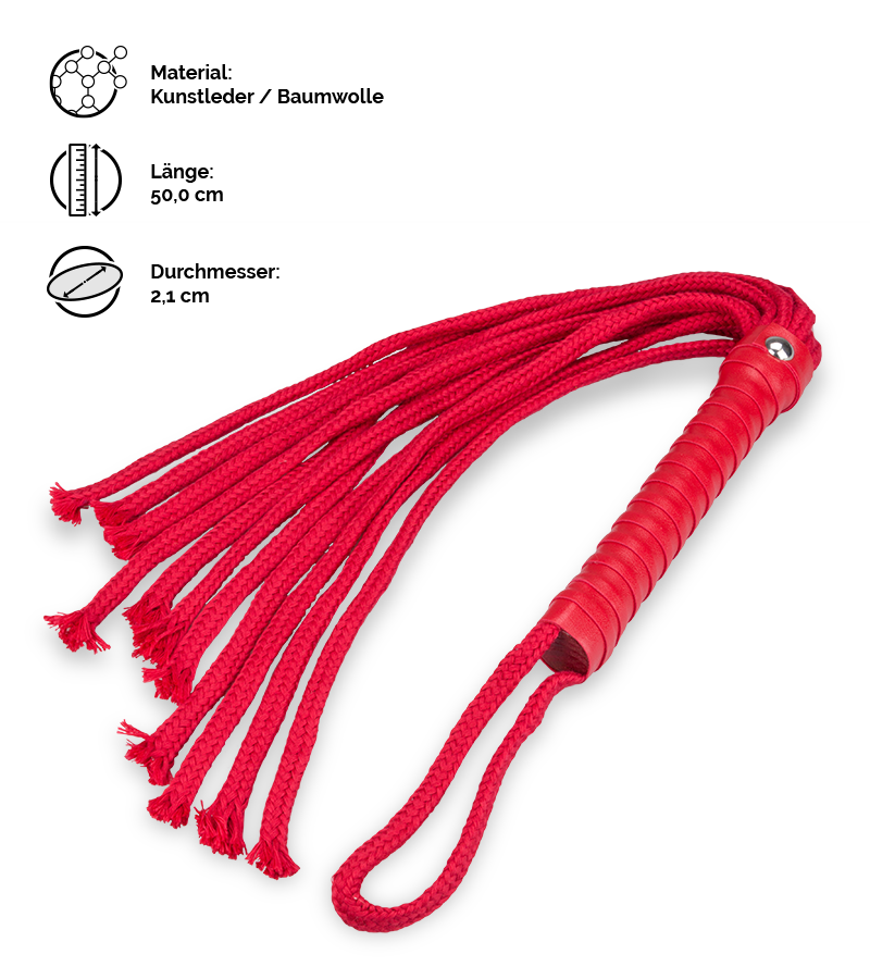 Die rote Riemenpeitsche ist 50 cm lang und hat einen Durchmesser von 2,1 cm.