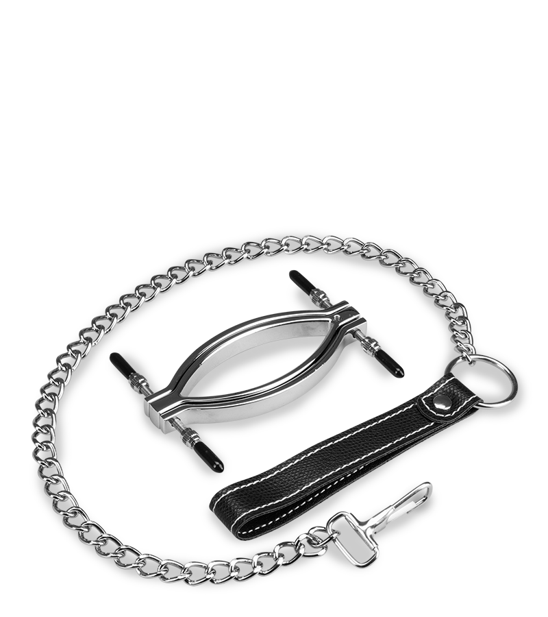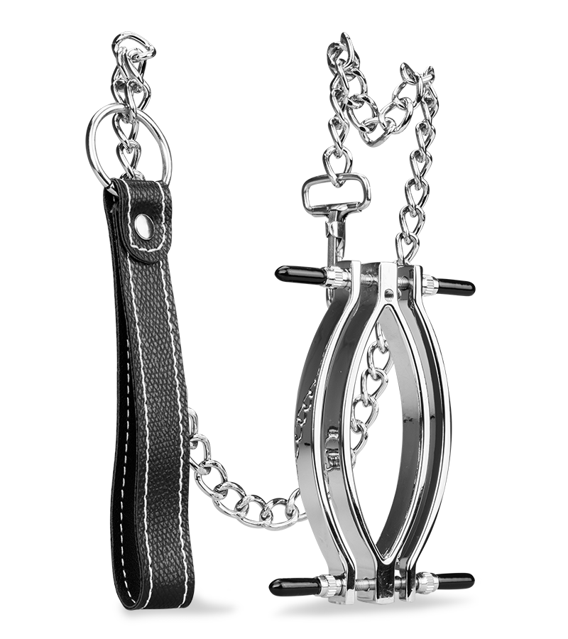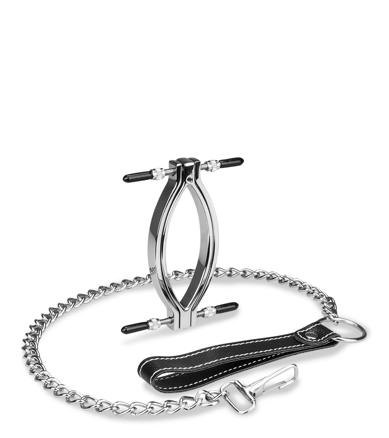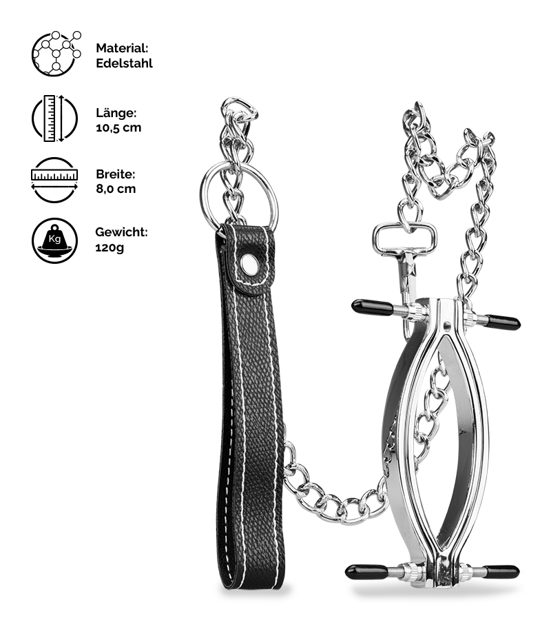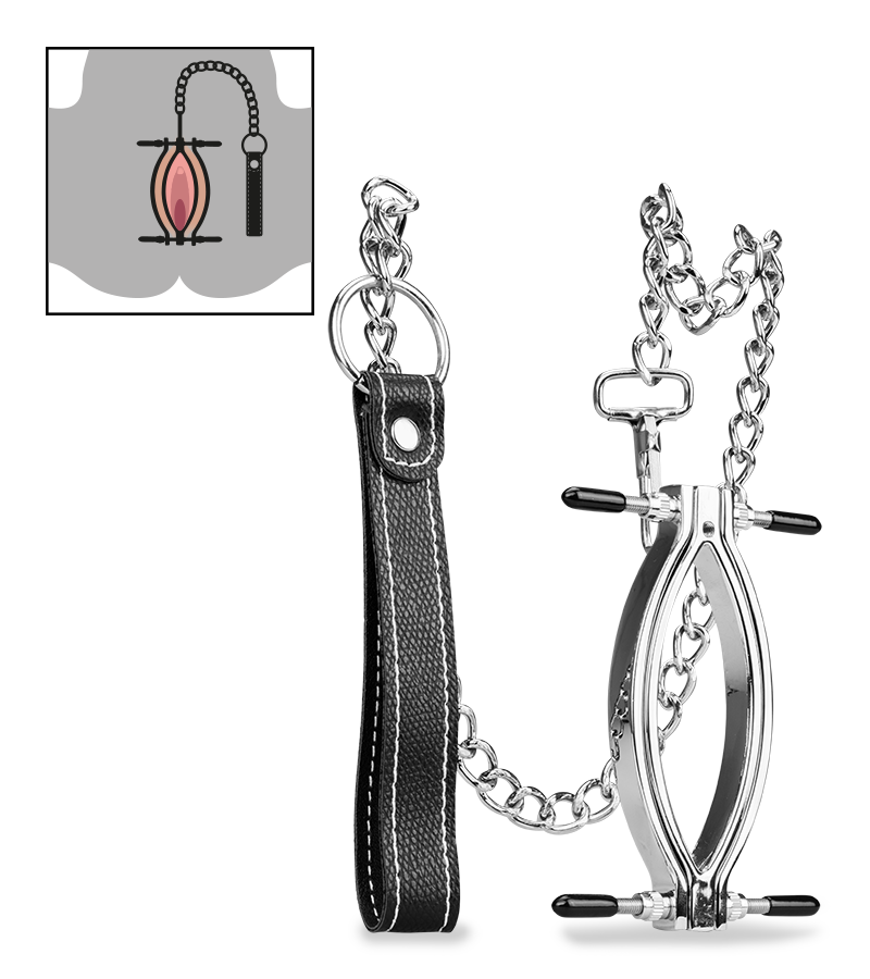 Der Schamlippenspreizer klemmt die Schamlippen ein und öffnet den Zugang zu Klitoris und Vagina. An der Klemme sind vier Stellschrauben befestigt, mit denen Sie selber entscheiden können, wie stark der Druck und damit der Schmerzreiz sein soll. Wenn Sie die mitgelieferte Leine an der Schamlippenklemme befestigen, können Sie Ihre Spielchen rund um Unterwerfung und Dominanz auf die Spitze treiben!