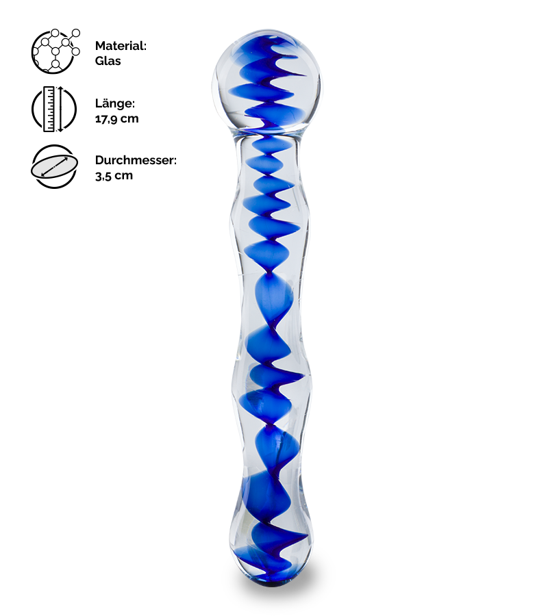 Das transparente Sexspielzeug aus Glas überzeugt auf den ersten Blick mit seiner eleganten Optik. Durch das Schaftinnere zieht sich ein blaues Spiralmuster. Aber der Dildo punktet auch mit seiner Schaftform. Der Dildo hat nämlich zahlreiche weiche Rundungen, die für einen unregelmäßigen Durchmesser sorgen. Wenn Sie auf eiskalte Cooling-Effekte stehen oder einen besonders heißen Lustmoment erleben möchten, dann legen Sie den Dildo aus Glas vor dem Gebrauch in kaltes oder heißes Wasser, bis er die gewünschte Temperatur erreicht hat. Der Dildo ist hypoallergen und kann mit Wasser und Seife ganz unkompliziert gereinigt werden.