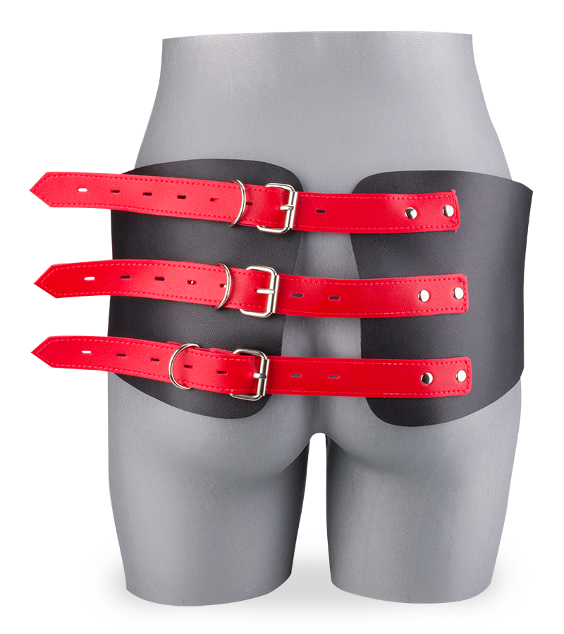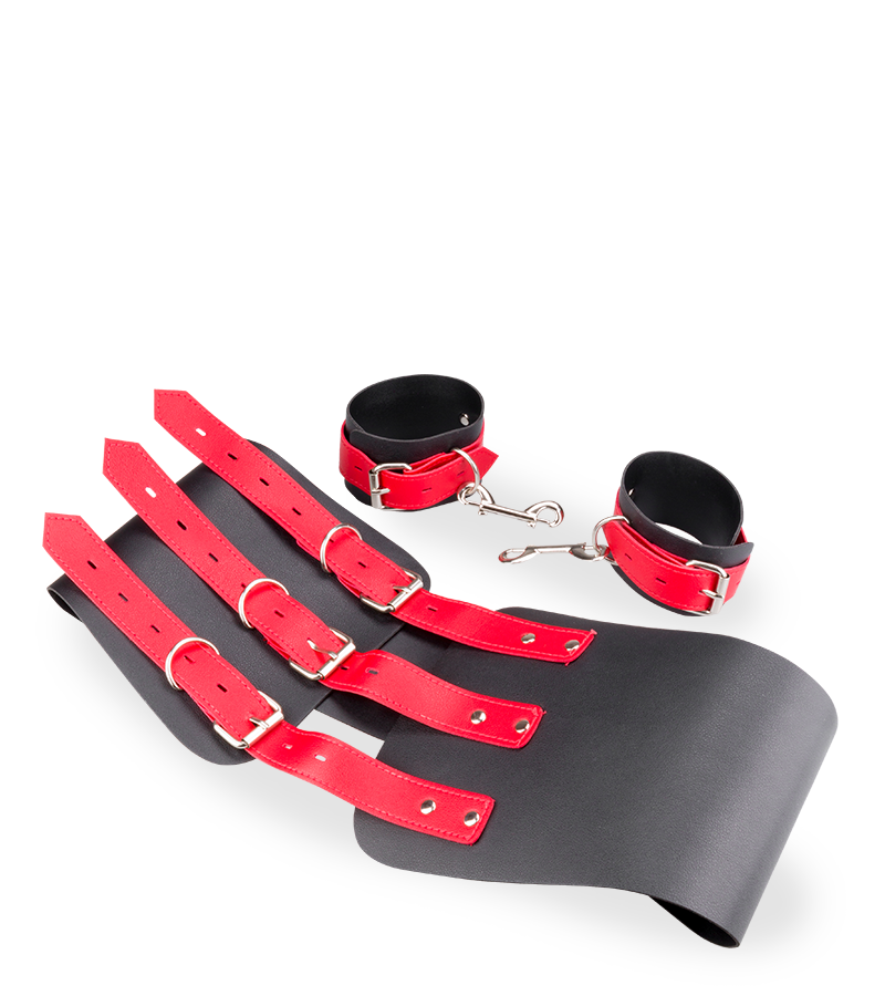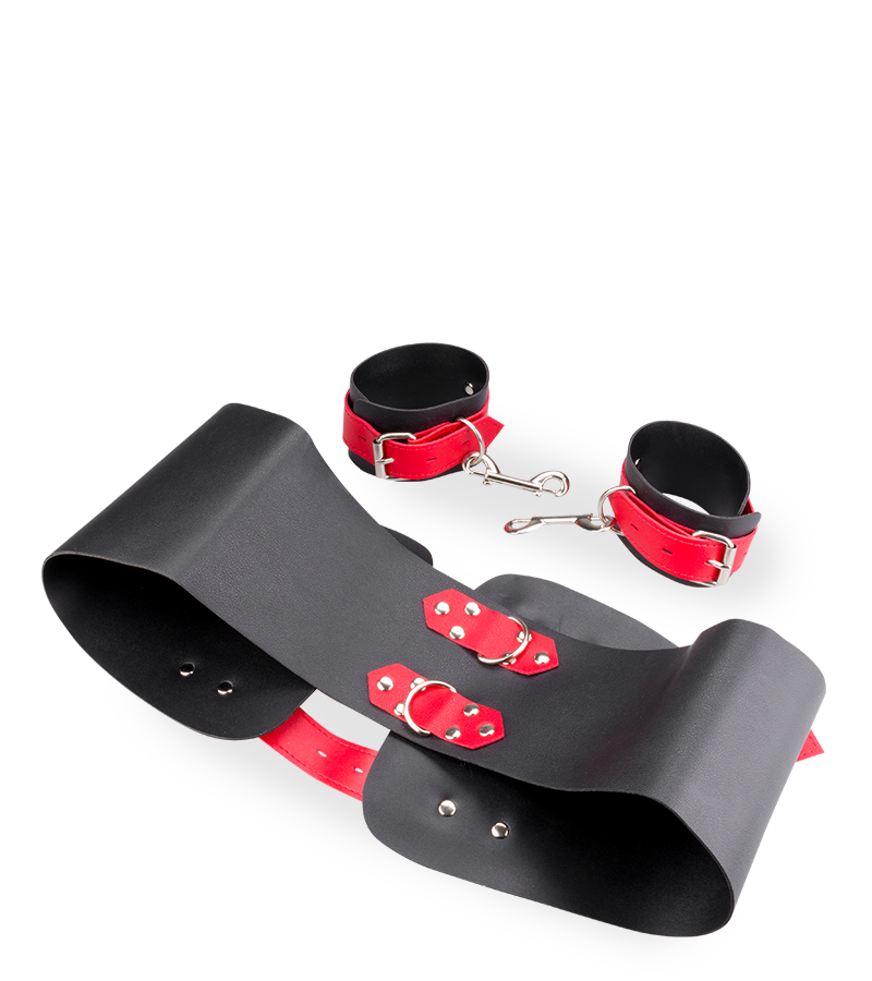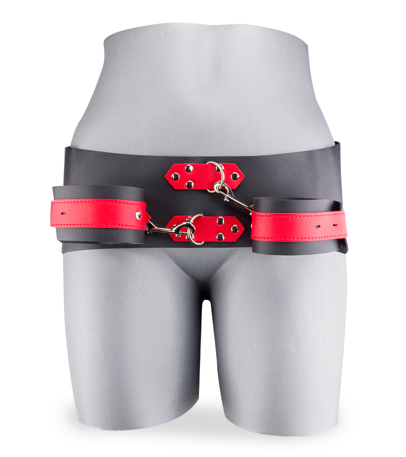Der Gürtel der Fessel wird um die Hüfte gelegt. Befestigen Sie dann die beiden Handfesseln für die Handgelenke an dem Gürtel, um die Hände auf Höhe der Hüfte zu fixieren und die Bewegungsfreiheit von Partnerin oder Partner einzuschränken. Die Fessel ist aus Kunstleder gefertigt und mit Metall-Elementen versehen. Sie ist solide und schick zugleich.